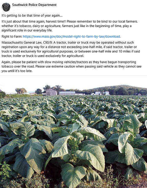 Southwick, Massachusetts is a rural town in western Massachusetts with a long agricultural history dating from before the town’s establishment in 1770. The town is known for its long-time cultivation of tobacco for cigars, which grows prolifically in the area, in part, due to the rich soils found in some sections of Southwick.